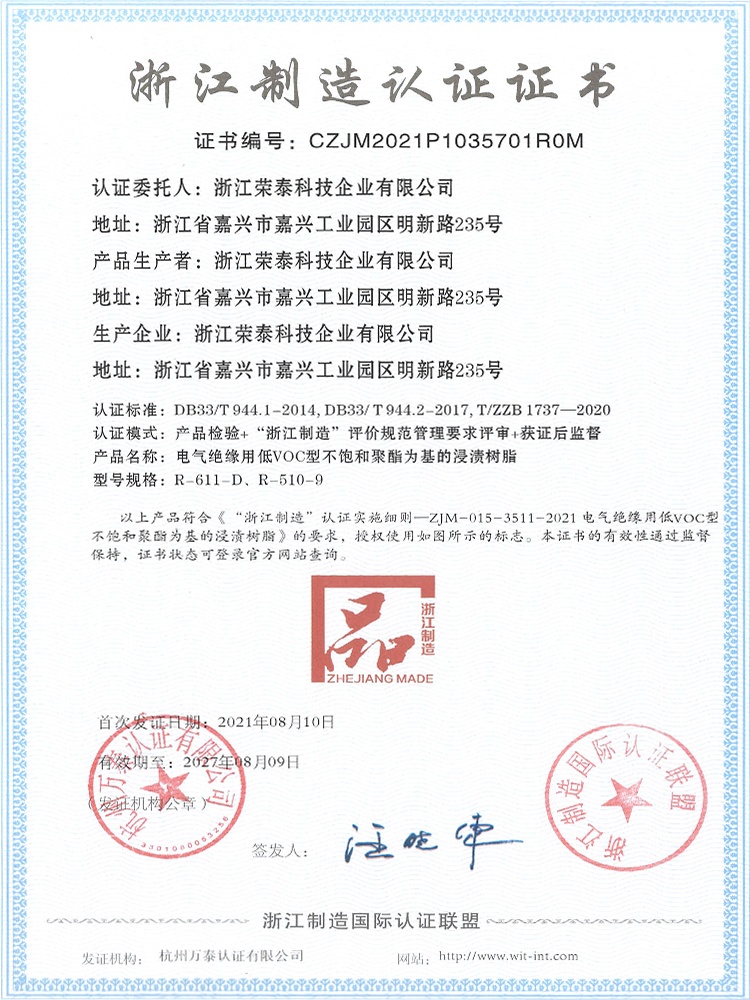 浙江榮泰科技企業有限公司是一家專業生產高性能絕緣材料的國家高新技術企業、國家“小巨人”企業,為國內絕緣漆生產制造領軍企業、全國絕緣材料行業協會的副理事長單位,生產規模、產品技術和創新能力處于同行業領先地位。